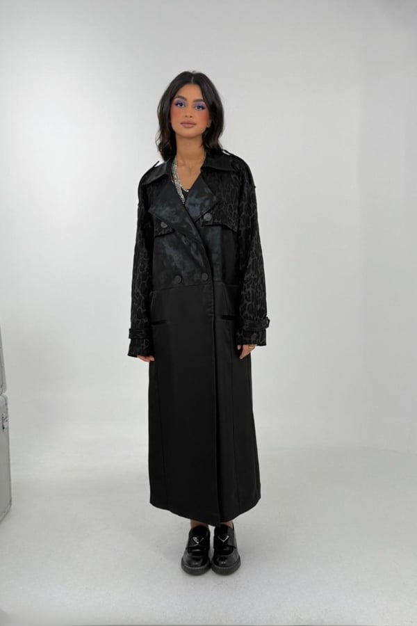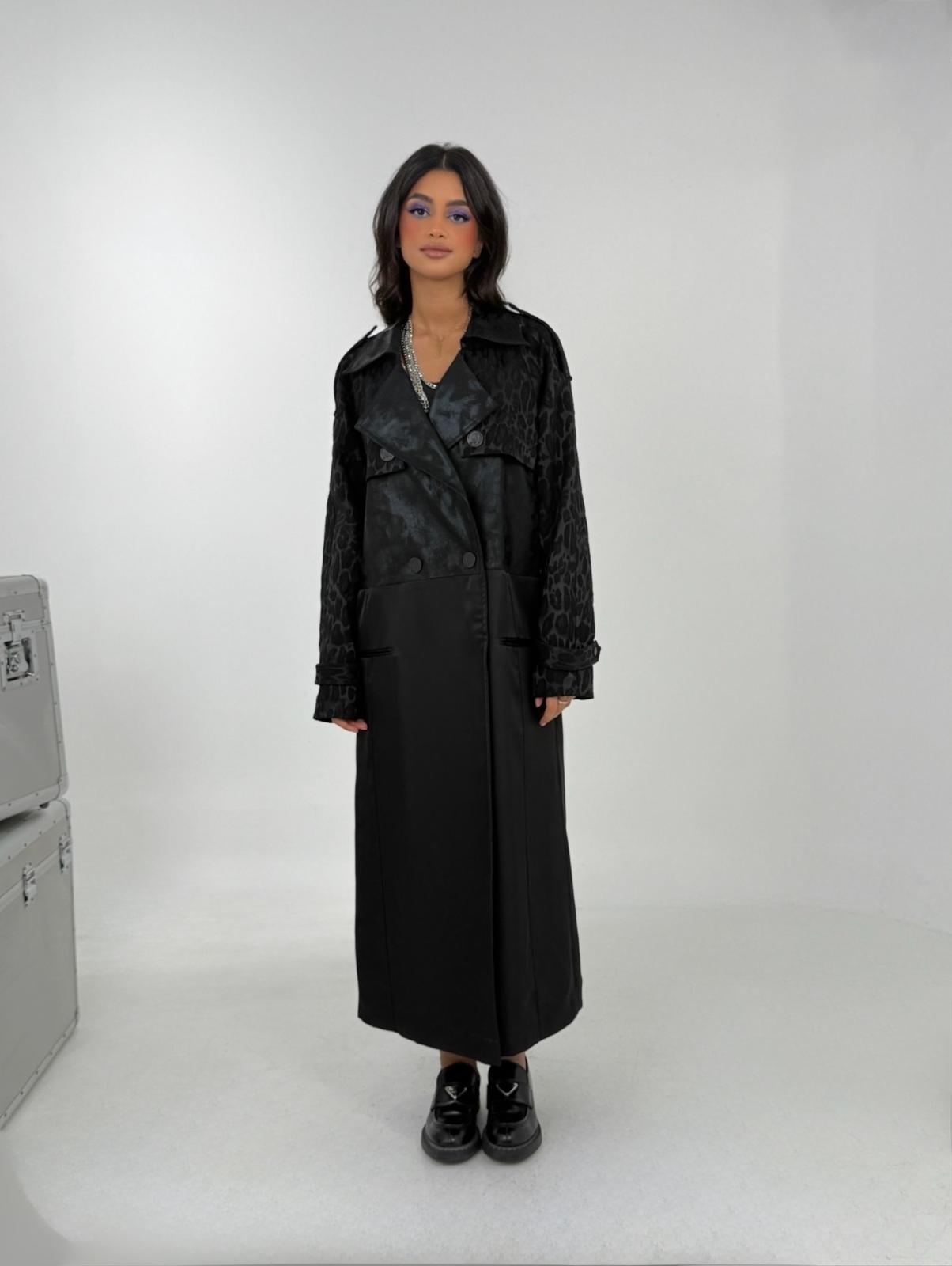 ALL BLACK BLOCKED TRENCH, LEOPARD JAQUAREDM, DEMIN, SILKY SATIN